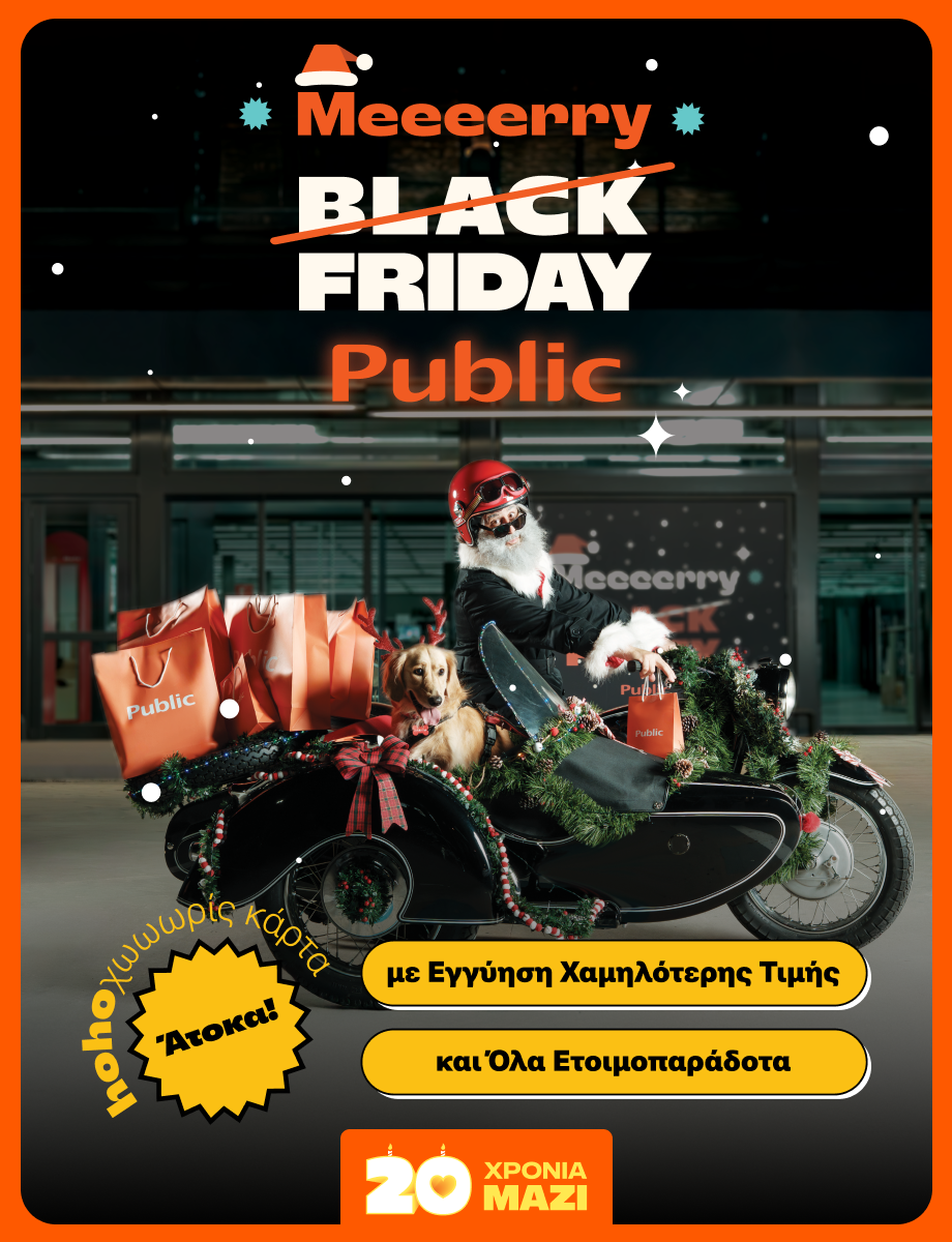 Τα Public παρουσιάζουν τη φετινή τους Black Friday καμπάνια με μια ξεχωριστή προσέγγιση που αποτυπώνει την εξέλιξη των καταναλωτικών συνηθειών: το Merry Friday. Η καμπάνια βασίζεται σε δύο σημαντικά insights της αγοράς – ολοένα και περισσότεροι καταναλωτές αξιοποιούν τις Black Friday εκπτώσεις για να προμηθευτούν τα Χριστουγεννιάτικα τους δώρα για φίλους και αγαπημένους, συνδυάζοντας έξυπνες αγορές με έγκαιρο σχεδιασμό. Την ίδια στιγμή, η Black Friday παραμένει η περίοδος που οι καταναλωτές επιλέγουν να κάνουν ένα δώρο και στον εαυτό τους, επενδύοντας σε προϊόντα που πραγματικά επιθυμούν.