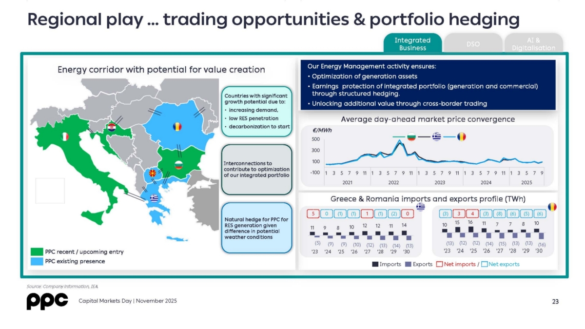 Για την τριετία 2026–2028, ο Όμιλος στοχεύει σε περαιτέρω γεωγραφική επέκταση σε Ιταλία, Βουλγαρία και Κροατία, αναπαράγοντας το καθετοποιημένο μοντέλο που εφαρμόζει ήδη στη Ρουμανία. Στο πλαίσιο αυτό, διαθέτει ήδη 25 σταθμούς ΑΠΕ στη ρουμανική αγορά, με 1,34 GW εγκατεστημένη ισχύ και 10,8 TWh ετήσια παροχή ενέργειας, στοιχεία που καταγράφηκαν στο εννεάμηνο του 2025.